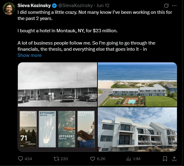 Main: I love when my friends dive into crazy projects. My friend Sieva just spent $23M on a 73-year-old hotel in Montauk. Here’s his deep dive. It’s a great read.