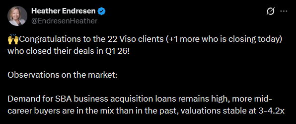 Main: Have I mentioned my podcast cohost Heather is a badass? Helping 23 people close business acquisitions is insane volume. (Work with her if you want SBA funding!)